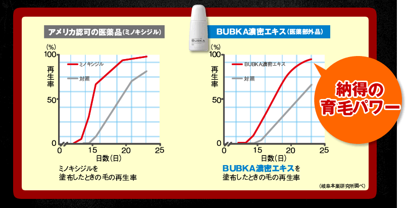 モニター試験で65人中60人が実感できたと回答した濃密育毛剤BUBKAの有効成分(ブブカ育毛エキス)の一つであるオウゴンエキス。 抜け毛の原因をジヒドロテストロンを77%阻害する事に成功。またアメリカが育毛・発毛効果を認可している医薬品であるミノキシジルと、BUBKA濃密エキスの効果を比べたところ、同程度の育毛効果が認められました。 完全無添加無香料でミノキシジルのように副作用の心配もなく、厚生労働省認可の男女とも安心して使用できる今ならBUBUKAサプリもついて育毛剤とWパワーでトータルサポートします。