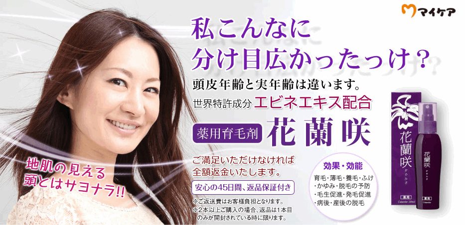 | 40代(女性) | 女性に高い支持を受けているという育毛剤の花蘭咲、私も、試しに使ってみましたが、支持されている理由が分かりましたよ。これまで、私の薄毛に効果的な育毛剤はなかったのですが、これは、すぐに効果を実感出来ました。試してよかったと心から思っています。 |